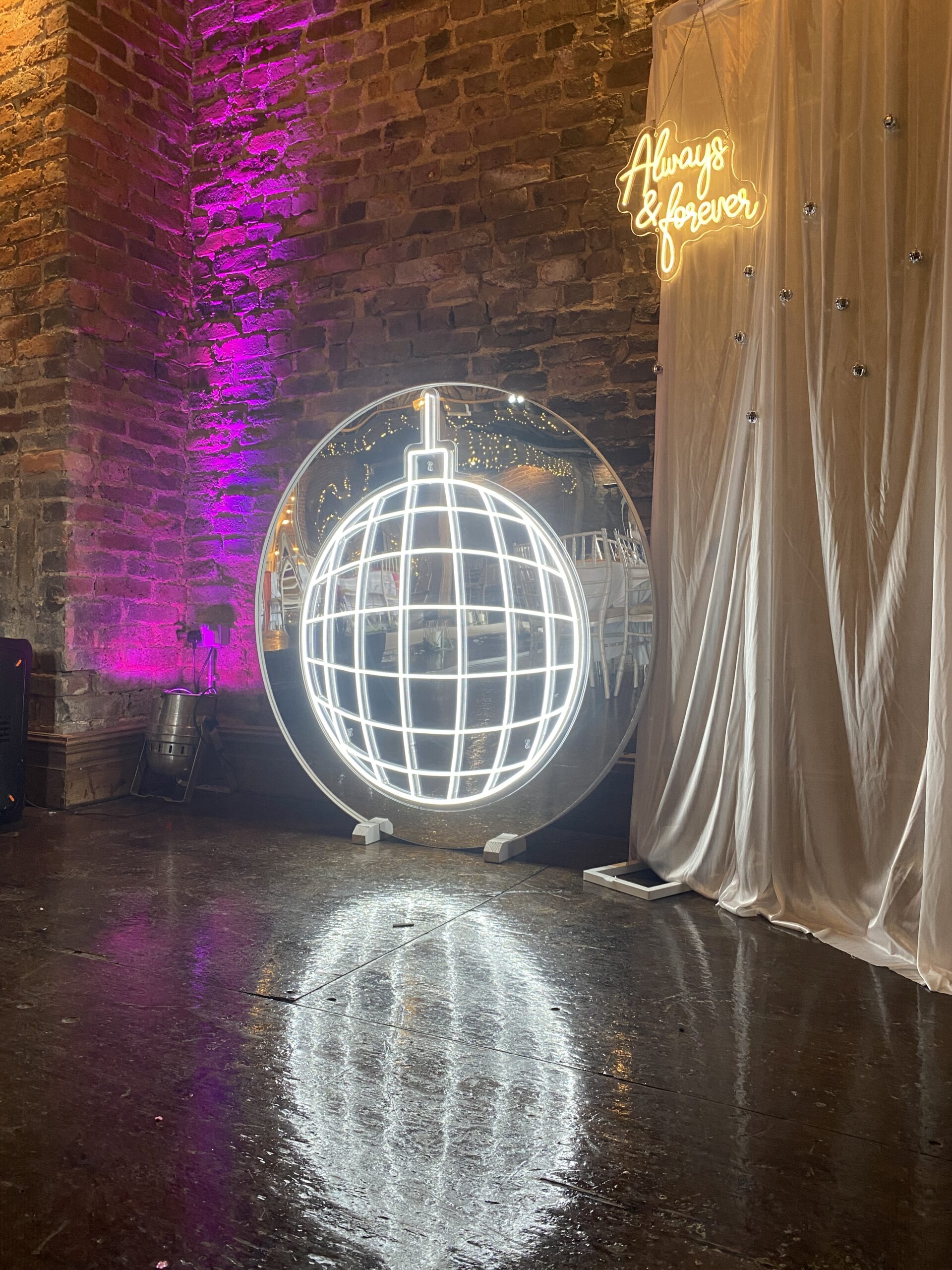 Set the tone for your party, wedding or event with our unique neon disco ball! Perfect alongside your dance floor, for your ceremony, or as its own feature. Light up your celebration and disco like there’s no tomorrow!